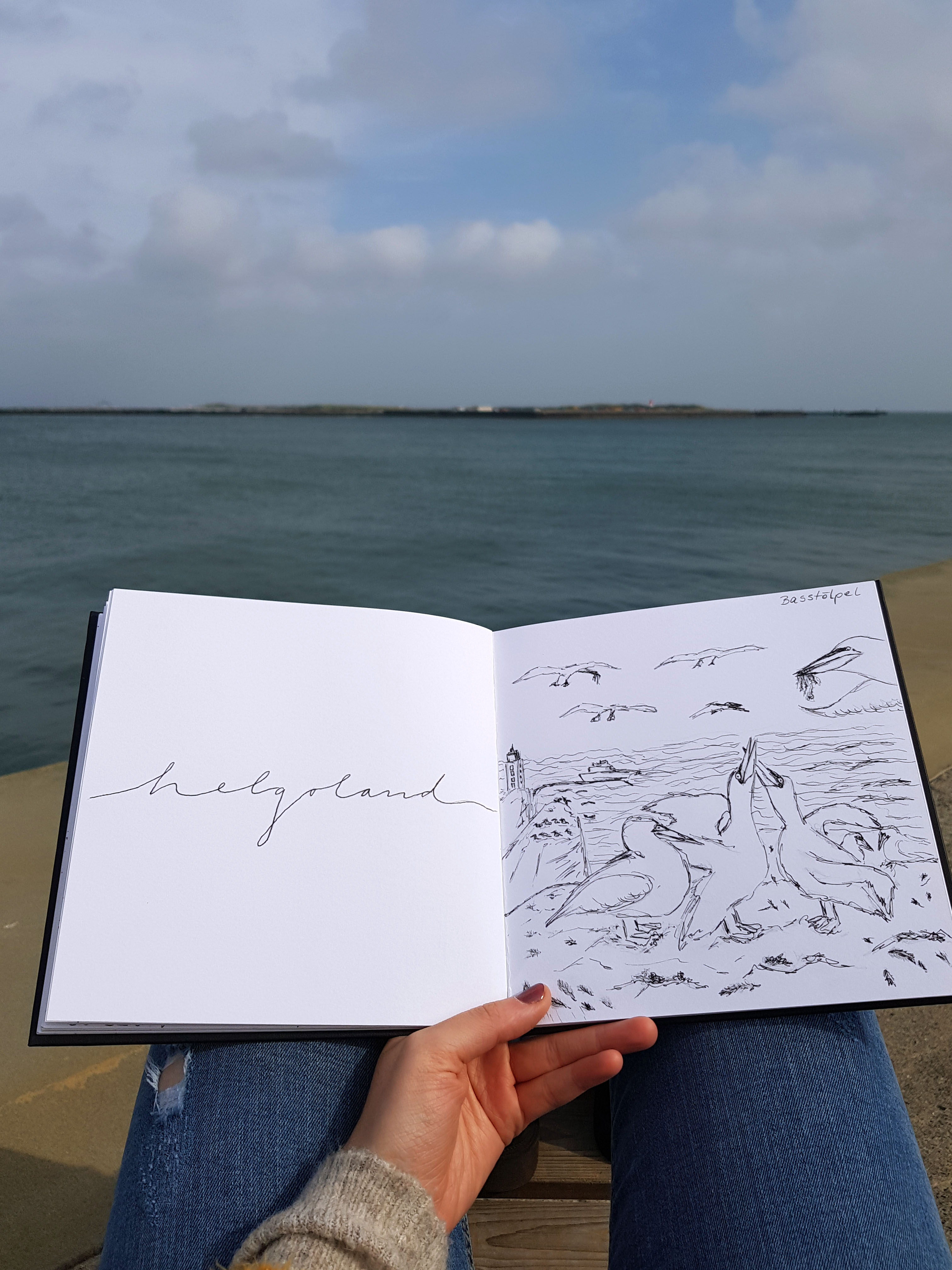 Helgoland ist nicht nur die einzige Hochseeinsel Deutschlands sondern liegt mit knapp 70 km auch am weitesten vom deutschen Festland entfernt, das sich somit nicht in Sichtweite befindet. Auf dem Oberland und während des Rundweges am Klippenrand habt ihr dadurch einen schönen Blick auf die weite des Meeres und die Düne, die sich einen knappen Kilometer von der Hauptinsel entfernt befindet. Das verstärkte für mich das Gefühl der Abgeschiedenheit. Einmal Loslassen, tief Luft holen und genießen! Unberührte Natur, fantastische Felsformationen und alle paar Meter eine Bank, um die Aussicht ganz in sich aufsaugen zu können – oder auch um das Skizzenbuch herausholen zu können. 😉