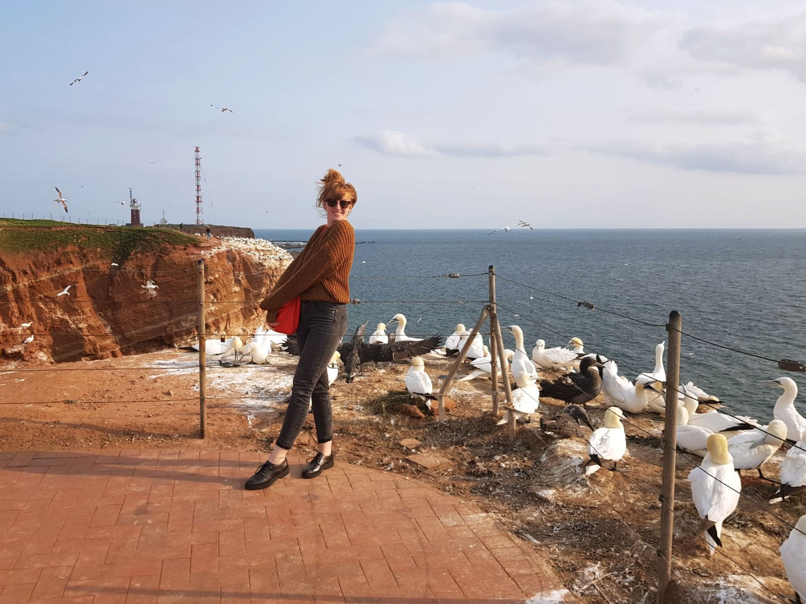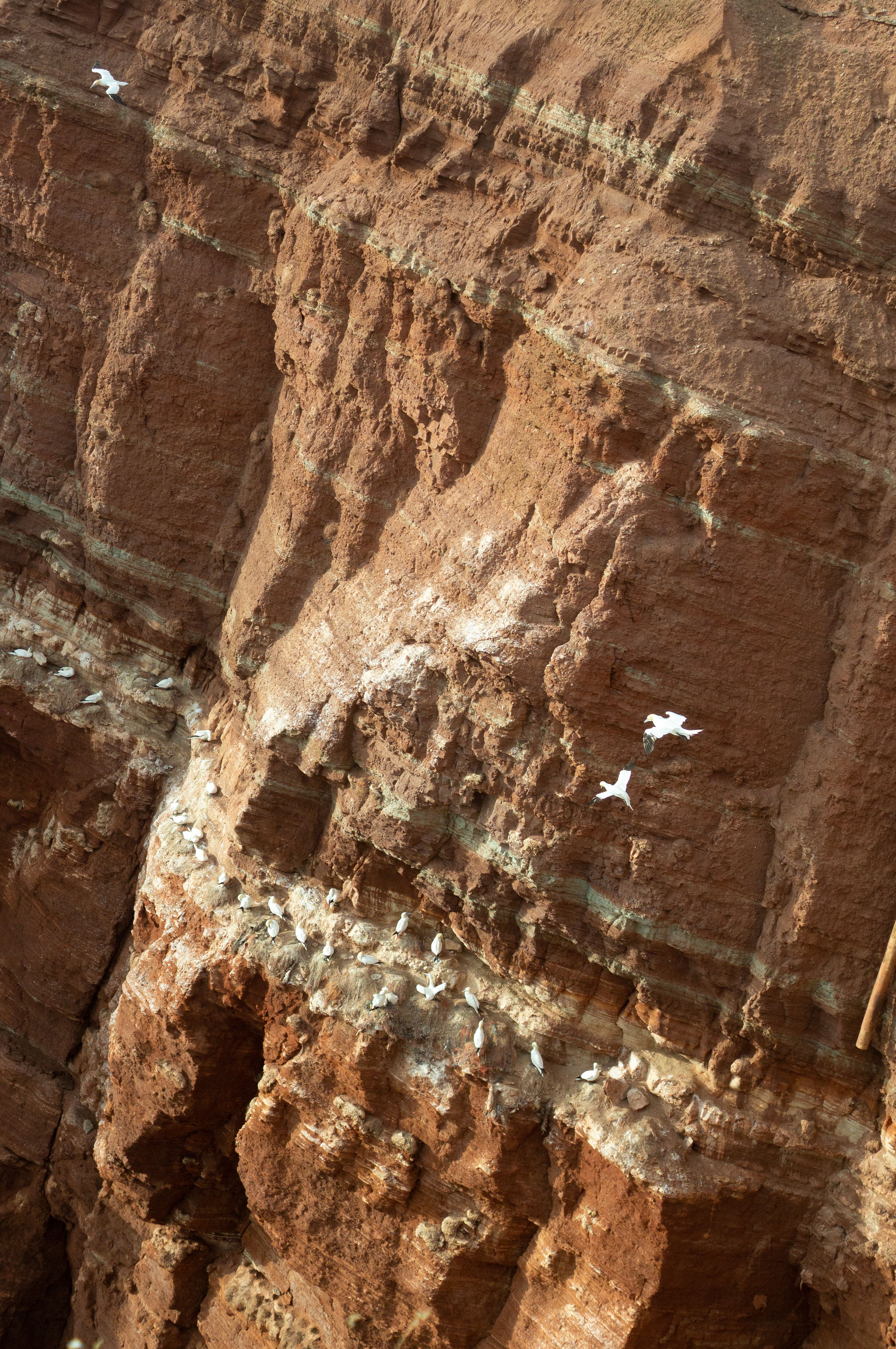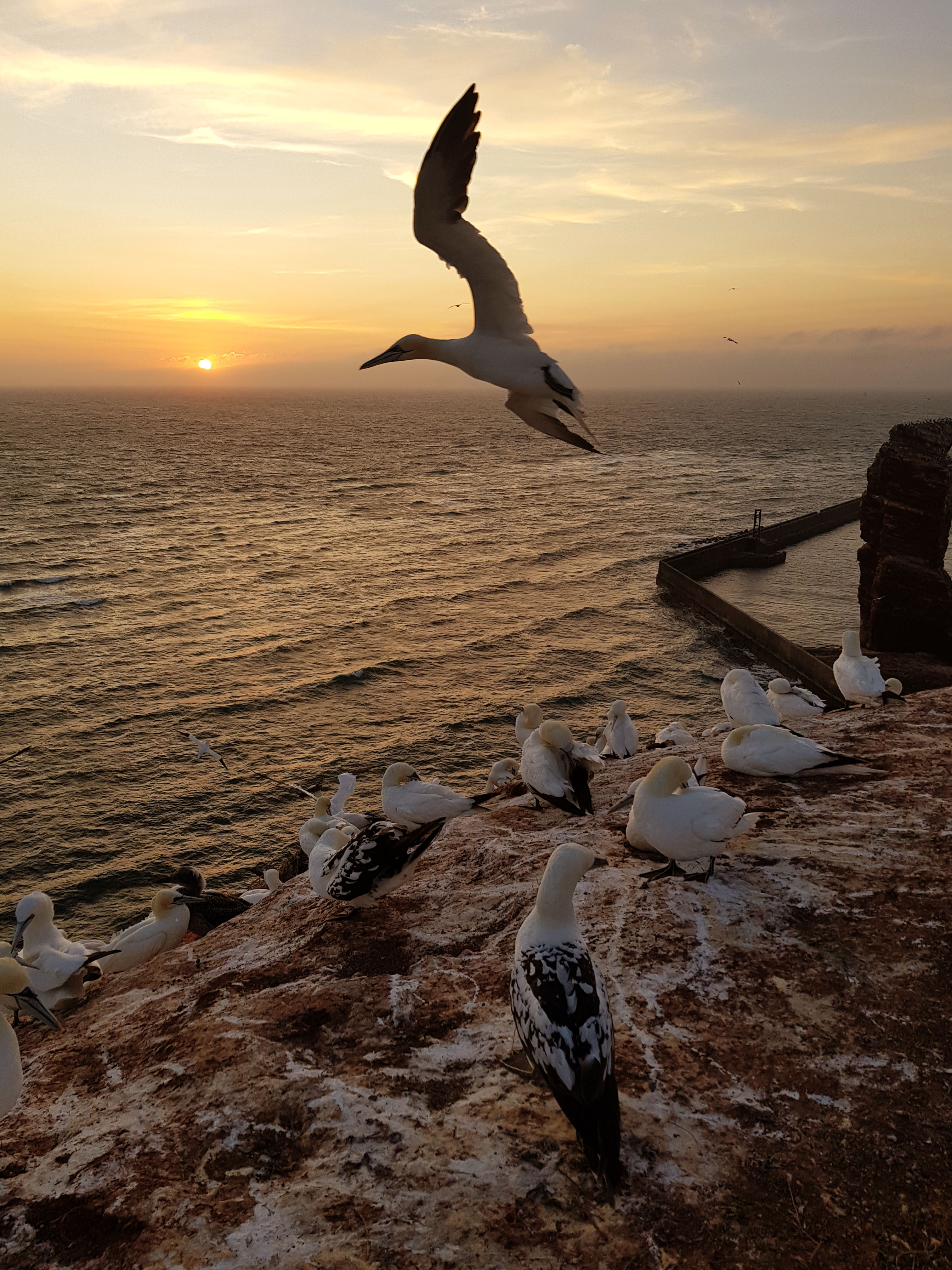 Ich persönlich war von der stattlichen Größe der Basstölpel beeindruckt und staunte nicht schlecht, als ich sah, wie nah wir ihnen kommen konnten. Überall an und auf den Felsen brüten Vogelpaare. Der bekannteste Fels unter ihnen und gleichzeitig ein ausgewiesenes Naturschutzgebiet erhielt den Namen Lummenfelsen, benannt nach den gleichnamigen Lummen-Vögeln. Im Gegensatz zum Rest der Insel geht es in der Nähe der Vögel ein wenig lauter zu und auch der typische Geruch zieht einem schnell in die Nase. Einige versorgen ihren Nachwuchs mit Futter, andere setzen zum Weiterflug an und schwebten über unsere Köpfe hinweg in Richtung Meer. Ein wahres Schauspiel!