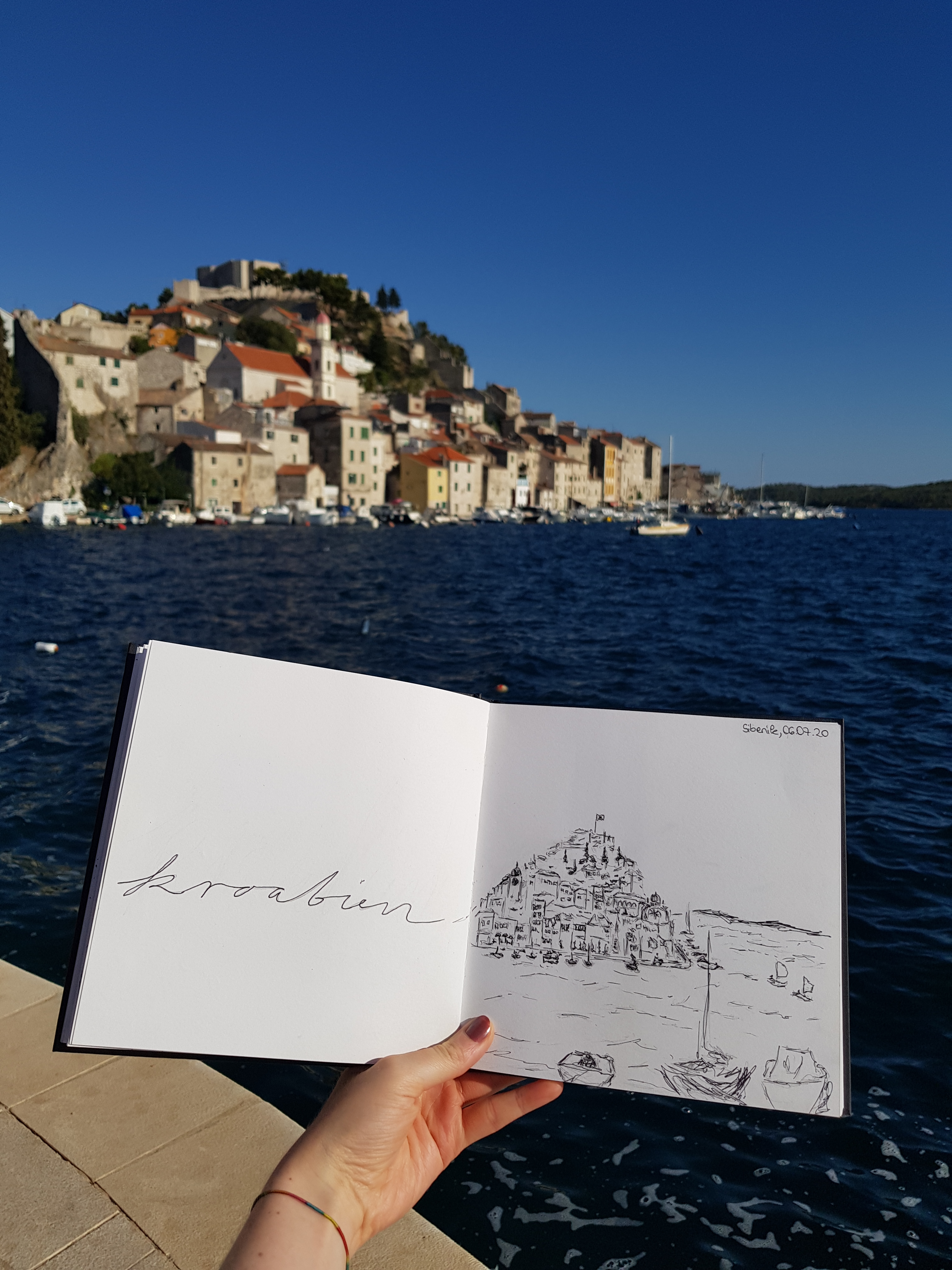 Dieses Postkartenmotiv schaffte es nicht nur in mein Skizzenbuch, sondern später auch auf eine Leinwand. Mein Gemälde „Hafenstadt“ vermittelt für mich genau dieses Gefühl von Sommertagen an der kroatischen Adria, das ich in diesem Moment in Šibenik empfand. In meinem Etsy-Shop ist das Motiv auch als Kunstdruck erhältlich.