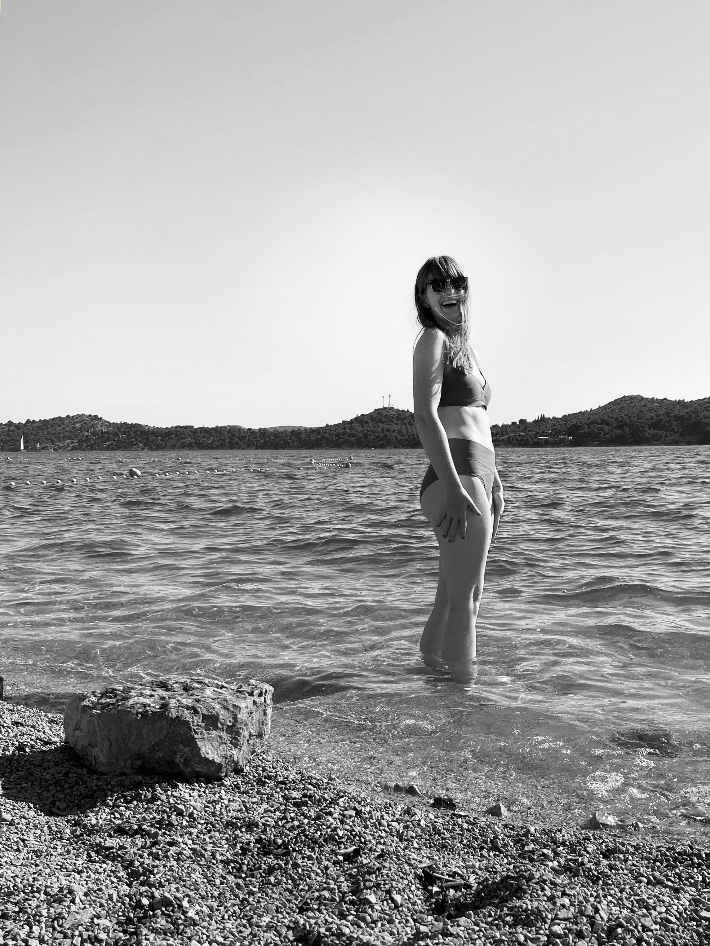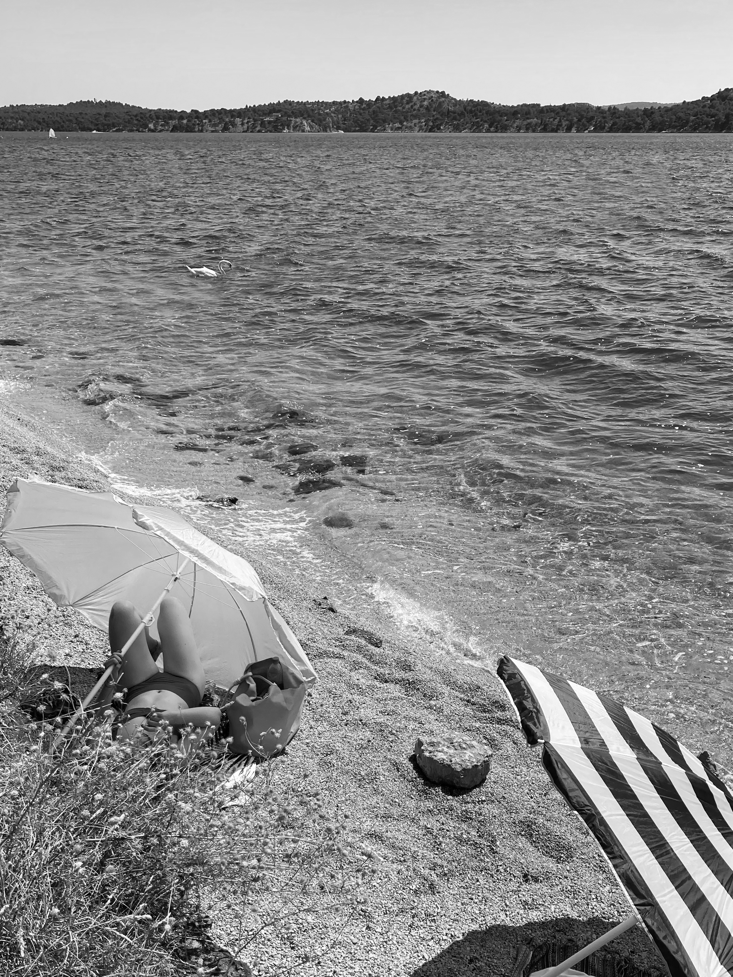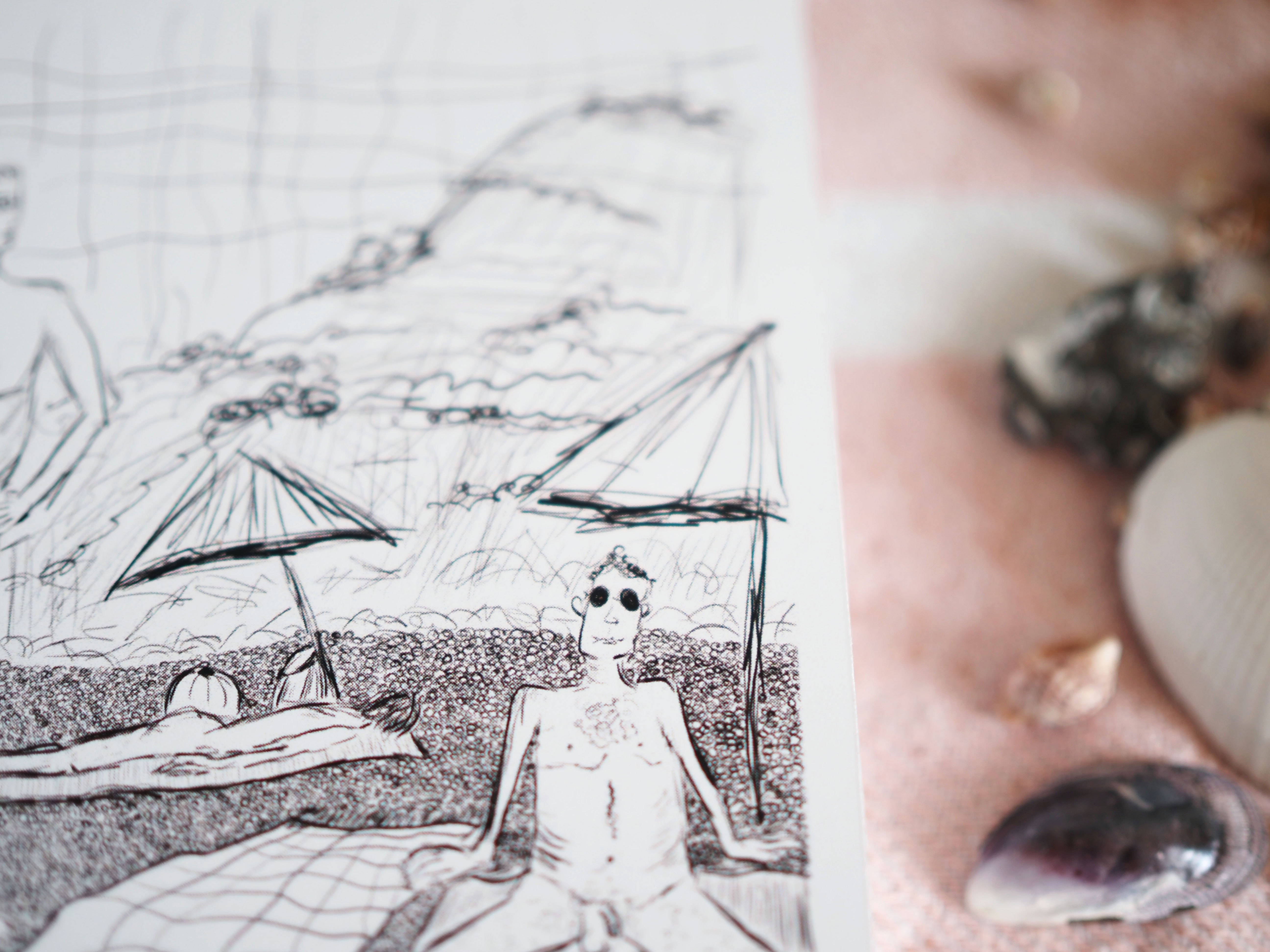 Während sich hinter uns die Steilküste mit weißen Felsen erstreckte und vor uns das kristallklare Wasser der Adria in seinen facettenreichen Blautönen glitzerte, begann ich mit einer Skizze und die Idee zu meiner Postkarte „Let’s get naked“ entstand.