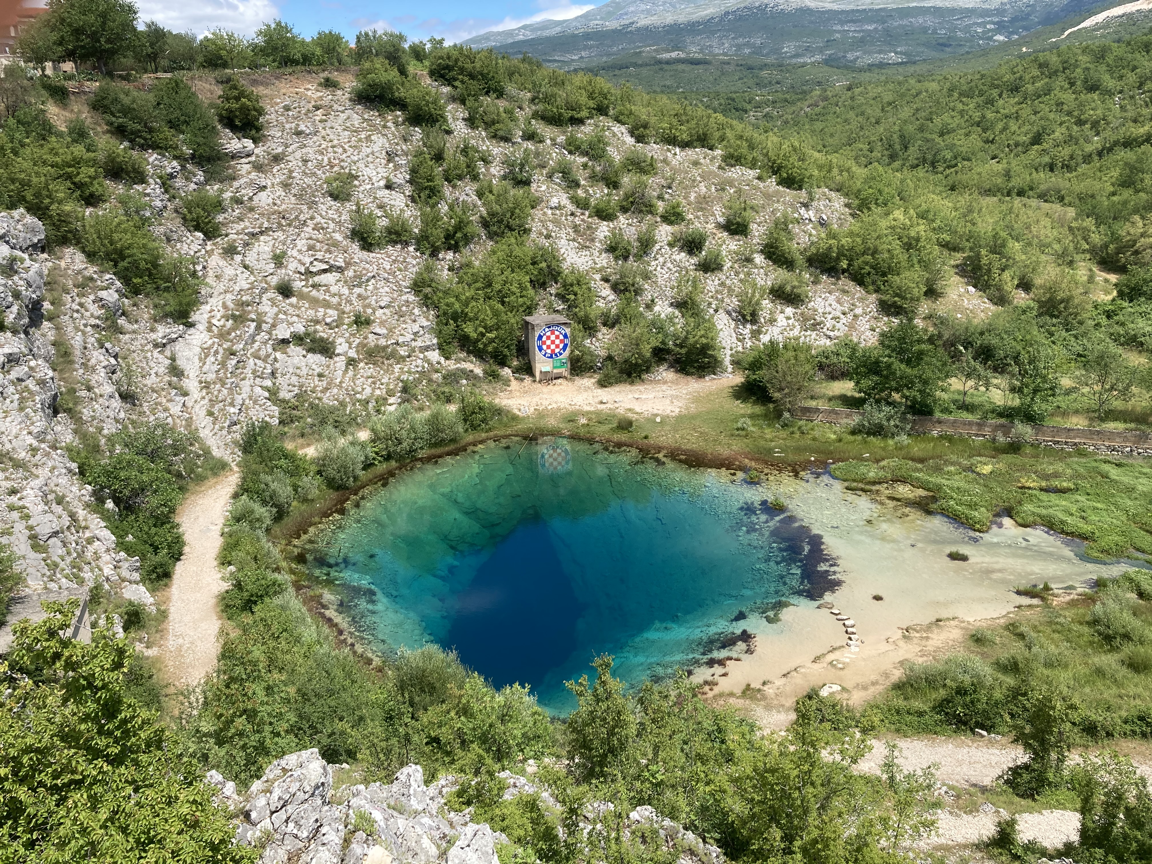 Wenn ihr das unscheinbare Areal mit der kleinen Kapelle erreicht, taucht direkt dahinter das blaue Auge von Glavaš auf. Fast magisch zog es uns mit seinen Farben in den Bann. Seitlich führt ein kleiner Weg hinab. Ein wirklich schöner Anblick, den wir jedem nur empfehlen können.