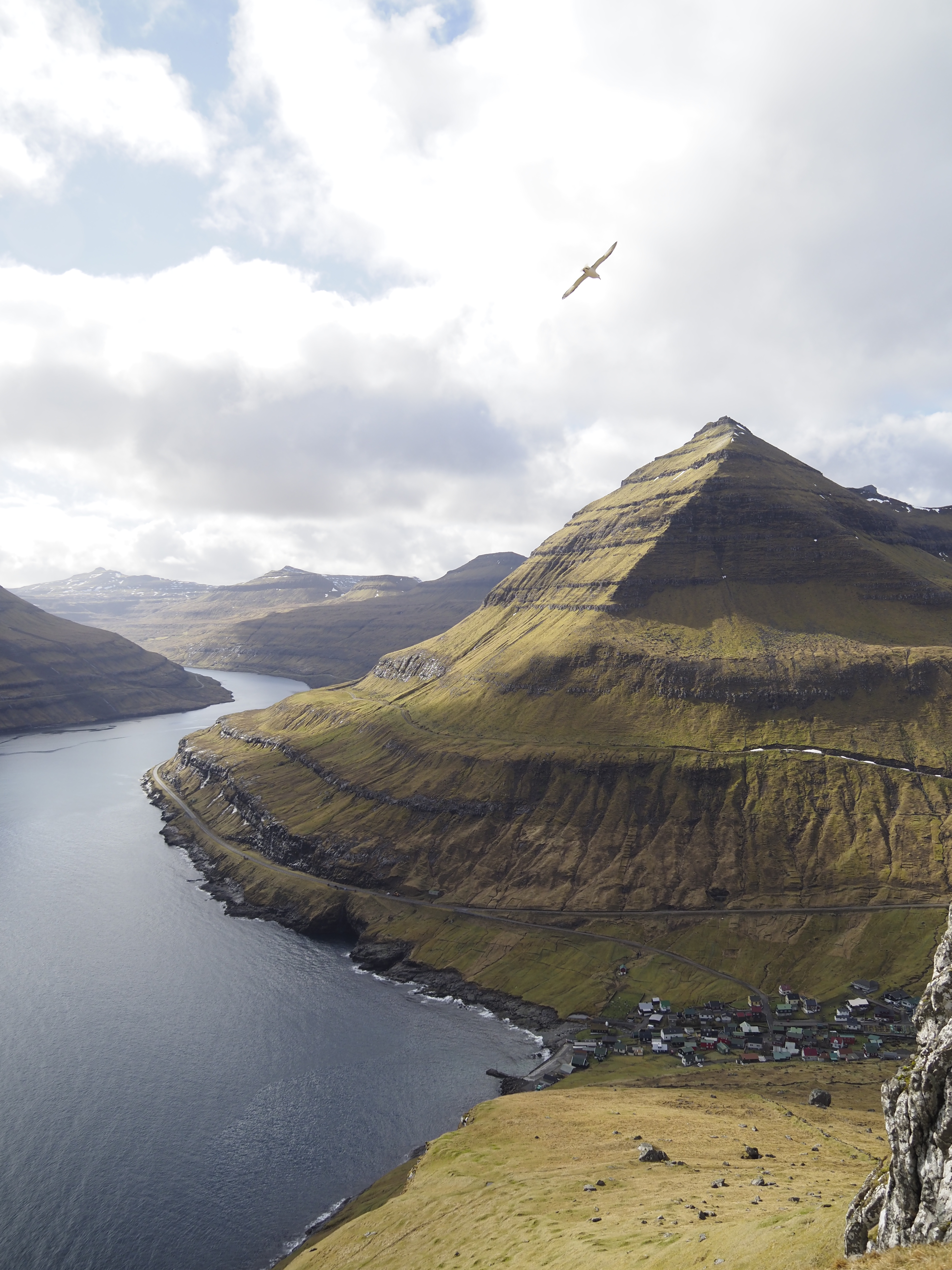 Folgt ihr der Straße weiter, gelangt ihr ins Örtchen Gjogv, das für seinen kleinen Naturhafen in einer Felsspalte bekannt ist. Direkt neben dem Naturhafen befindet sich der Eingang zu einer Wanderroute hinauf auf den Felsen. Oben angekommen hast du einen einzigartigen Blick auf das Meer und die schroffe Küstenlinie.