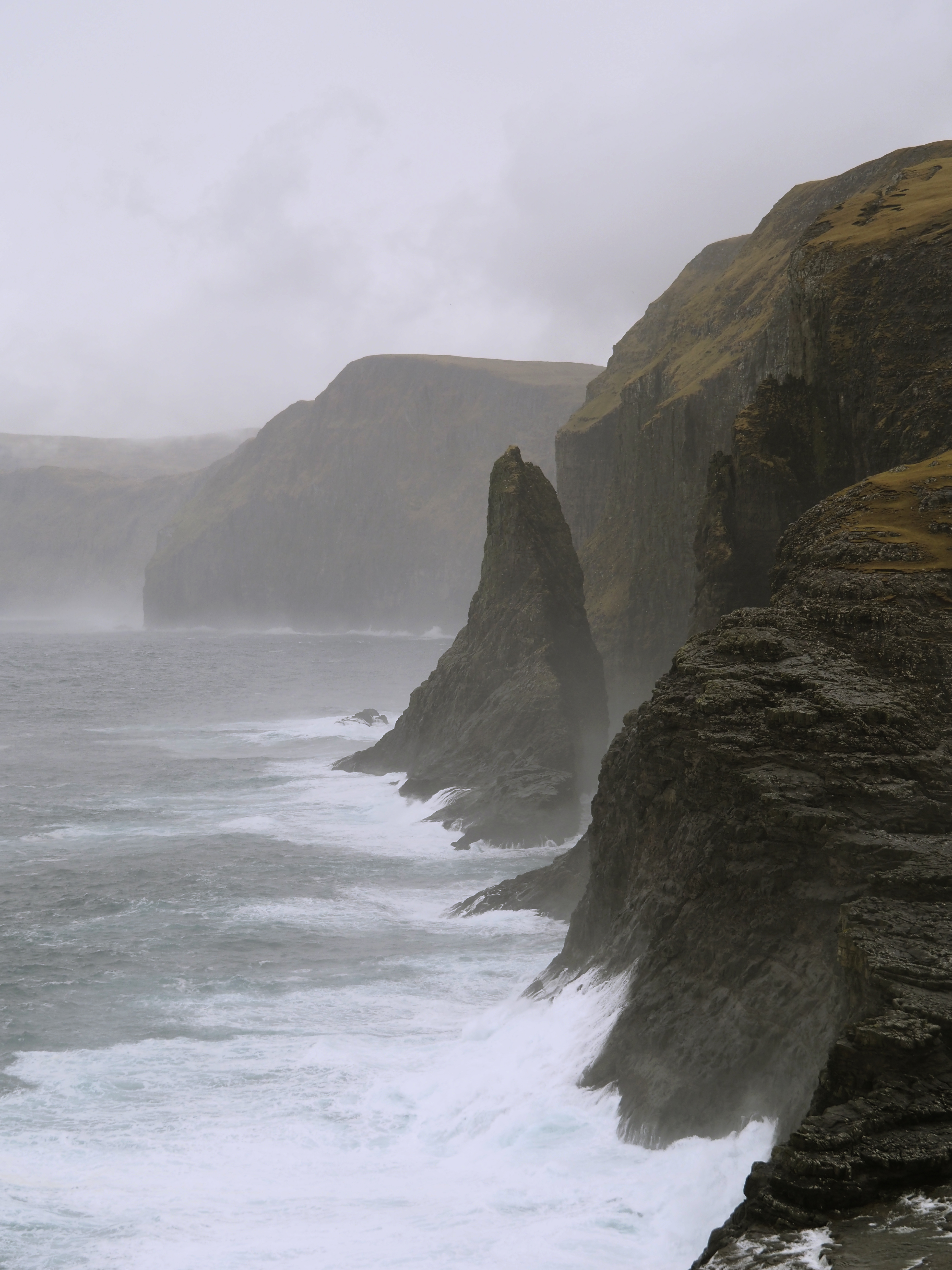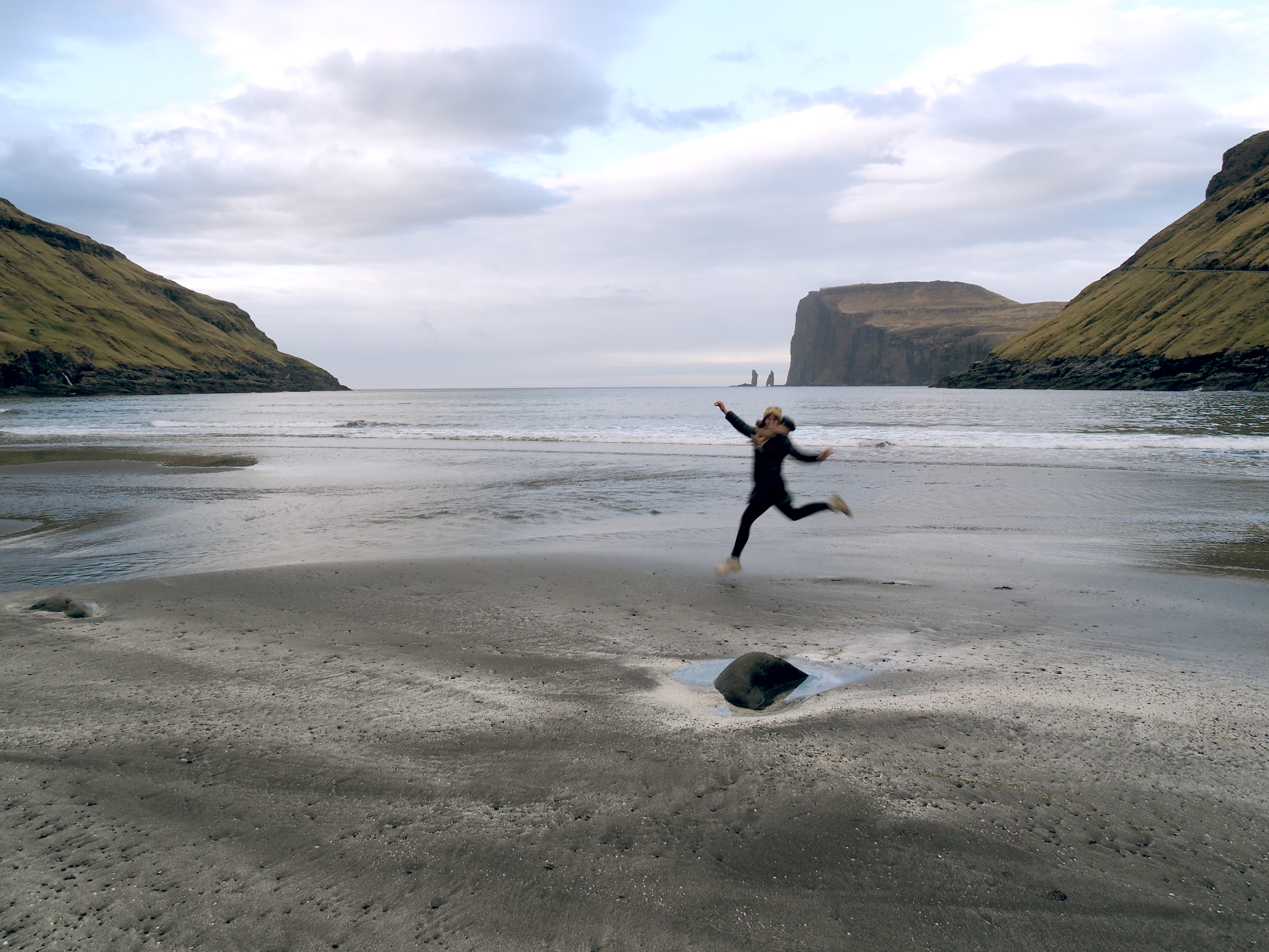 Die Zufahrt ist ziemlich schmal und führt direkt am Fjord entlang. Vor Ort steht nur eine begrenzte Anzahl an Parkplätzen zur Verfügung, die im Sommer sicher gut gefüllt sind. Schön anzusehen sind hier ebenfalls die zwei Felsen – Risin und Kelligin – die in weiter Ferne aus dem Meer ragen. Ab hier startet ein Wanderweg über die Gipfel nach Saksun, wofür wir selbst leider nicht genug Zeit hatten.