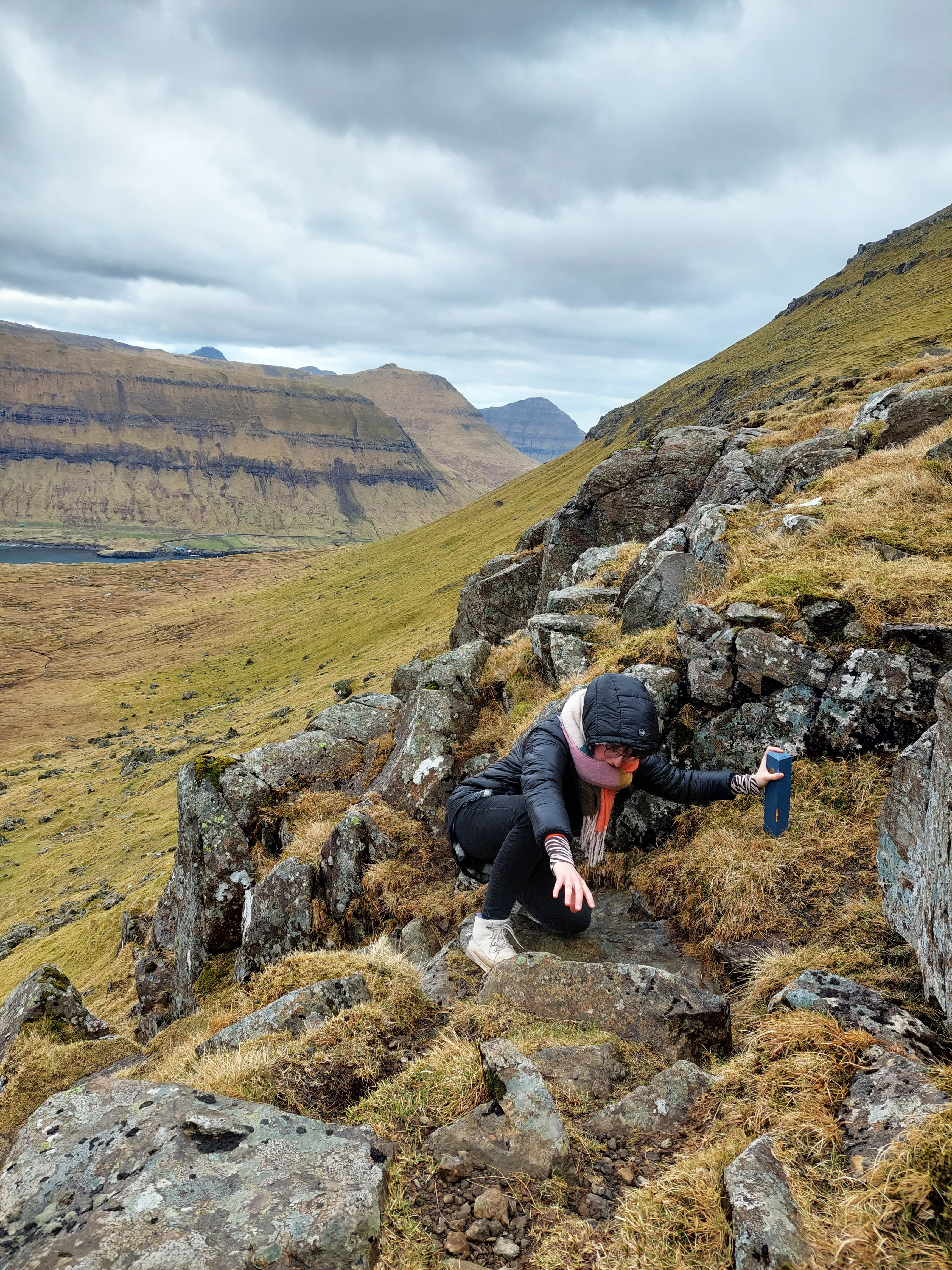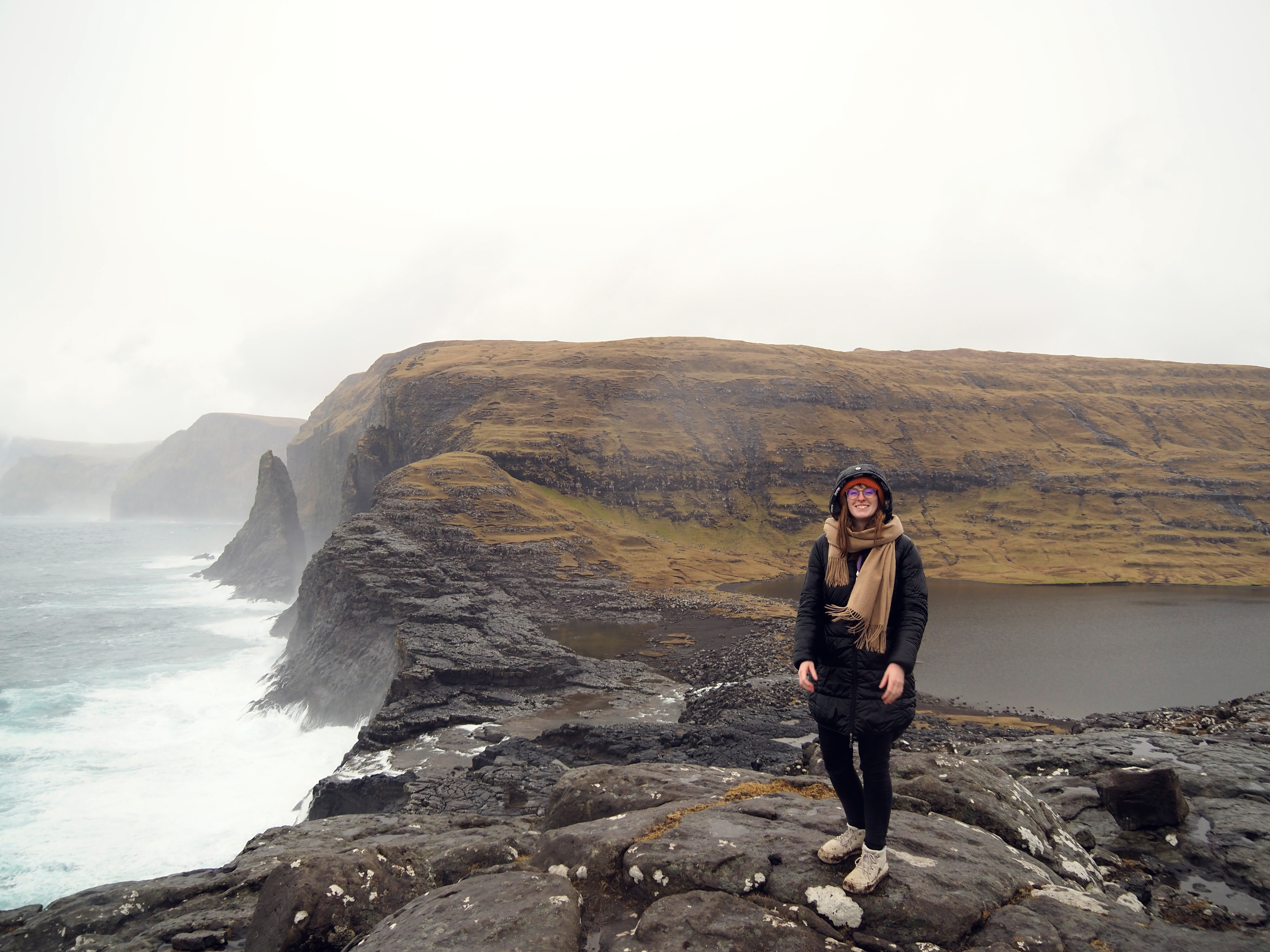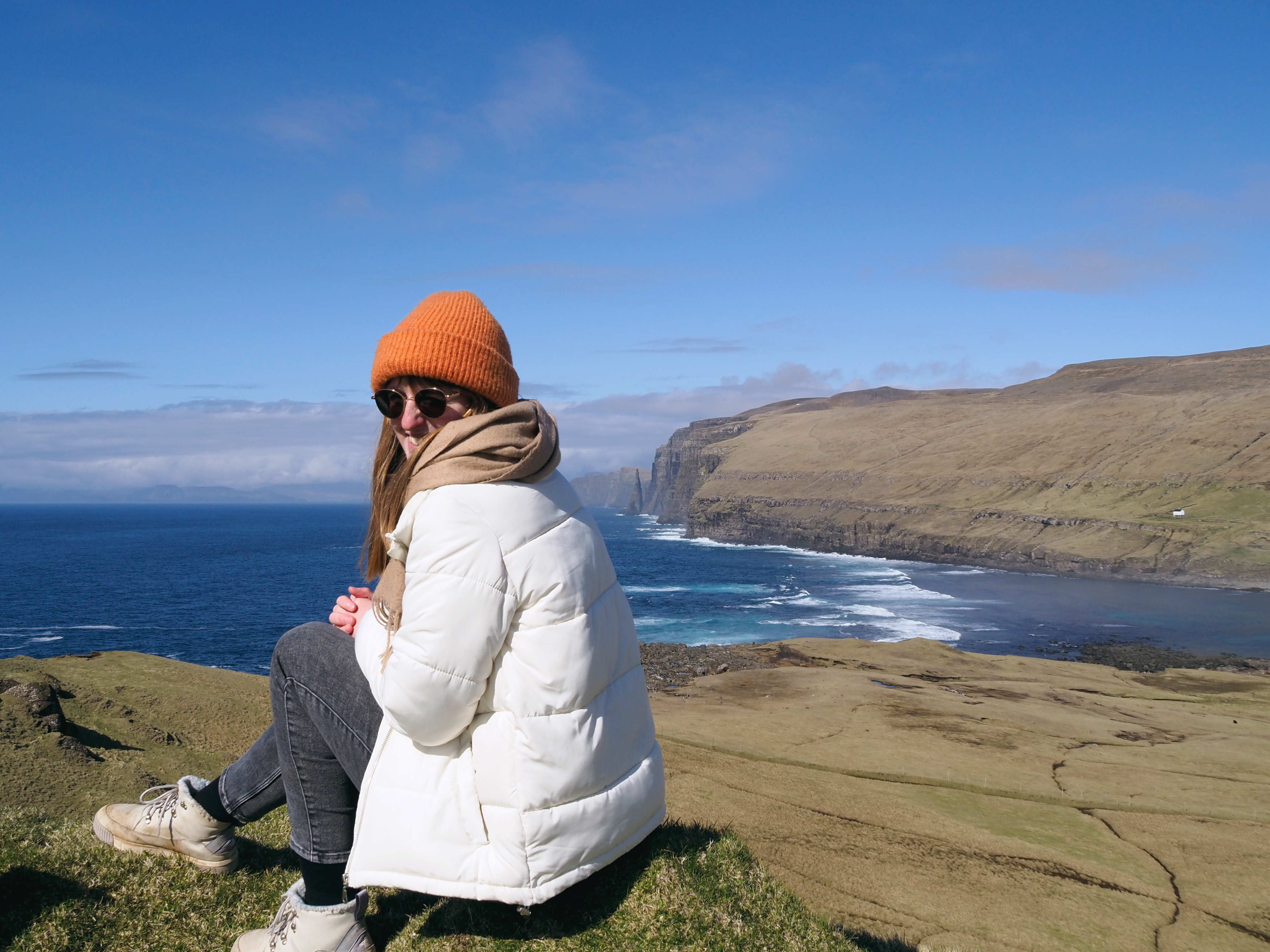 Meine liebste und gleichzeitig für mich herausfordernde Wanderung war nahe Funningur. Funningur ist ein ruhiges Dorf auf der Insel Eysturoy und befindet sich am Fuße des höchsten Berges Slættaratindur der Färöer Inseln. Nach einem Spaziergang durch das kleine Dorf mit seiner torfbedeckten Kirche direkt im Fjord fuhren wir weiter in Richtung Gjogv und entdeckten den Aussichtspunkt Hvíthamar. Die Wanderung ist ein Rundweg, als leicht ausgeschrieben und für Kinder machbar. Als jemand mit Höhenangst kann ich sagen, dass der Anstieg für mich deutlich steiler wirkte und eine echte Überwindung kostete. Oben angekommen wurde ich jedoch mit einem wahnsinnigen Ausblick belohnt. Vögel kreisten über unseren Köpfen während wir unsere Blicke über die Berge und Fjorde schweifen ließen. Einfach durchatmen und genießen!
