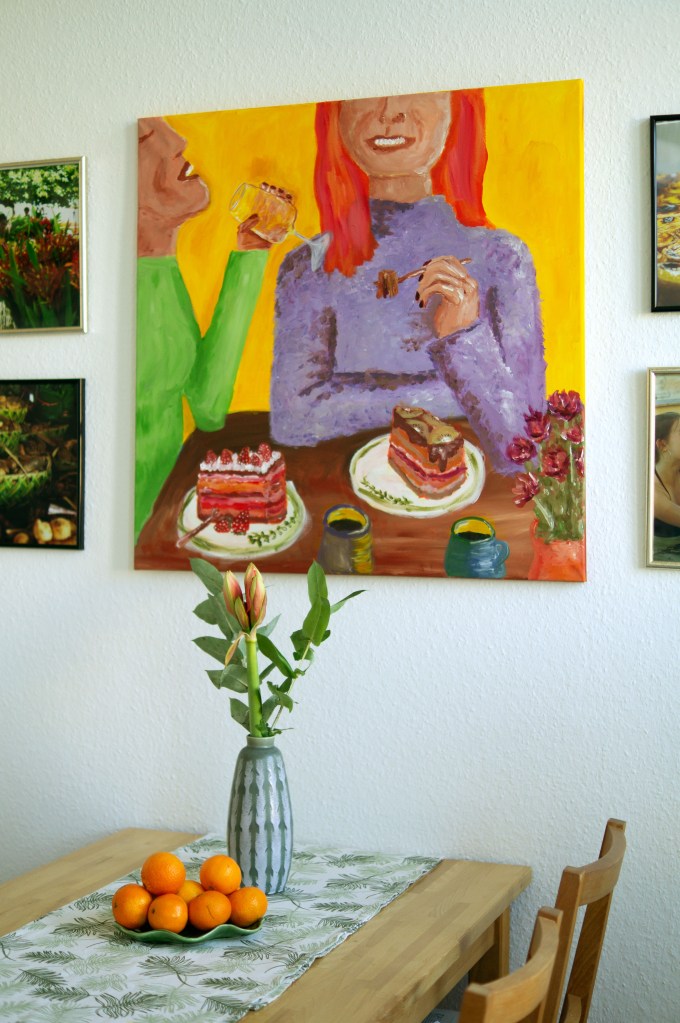 Eines meiner Lieblingsgemälde ist „Herzlicher Lacher“. Es ist in einer Zeit entstanden, als ich das Vespern mit meinen Freundinnen am Nachmittag wahnsinnig vermisste, das Zusammensitzen, über alles reden, gemeinsam lachen. Dieses Bild erinnert mich an die vielen kleinen Dinge, die wir leider viel zu oft für selbstverständlich nehmen.
