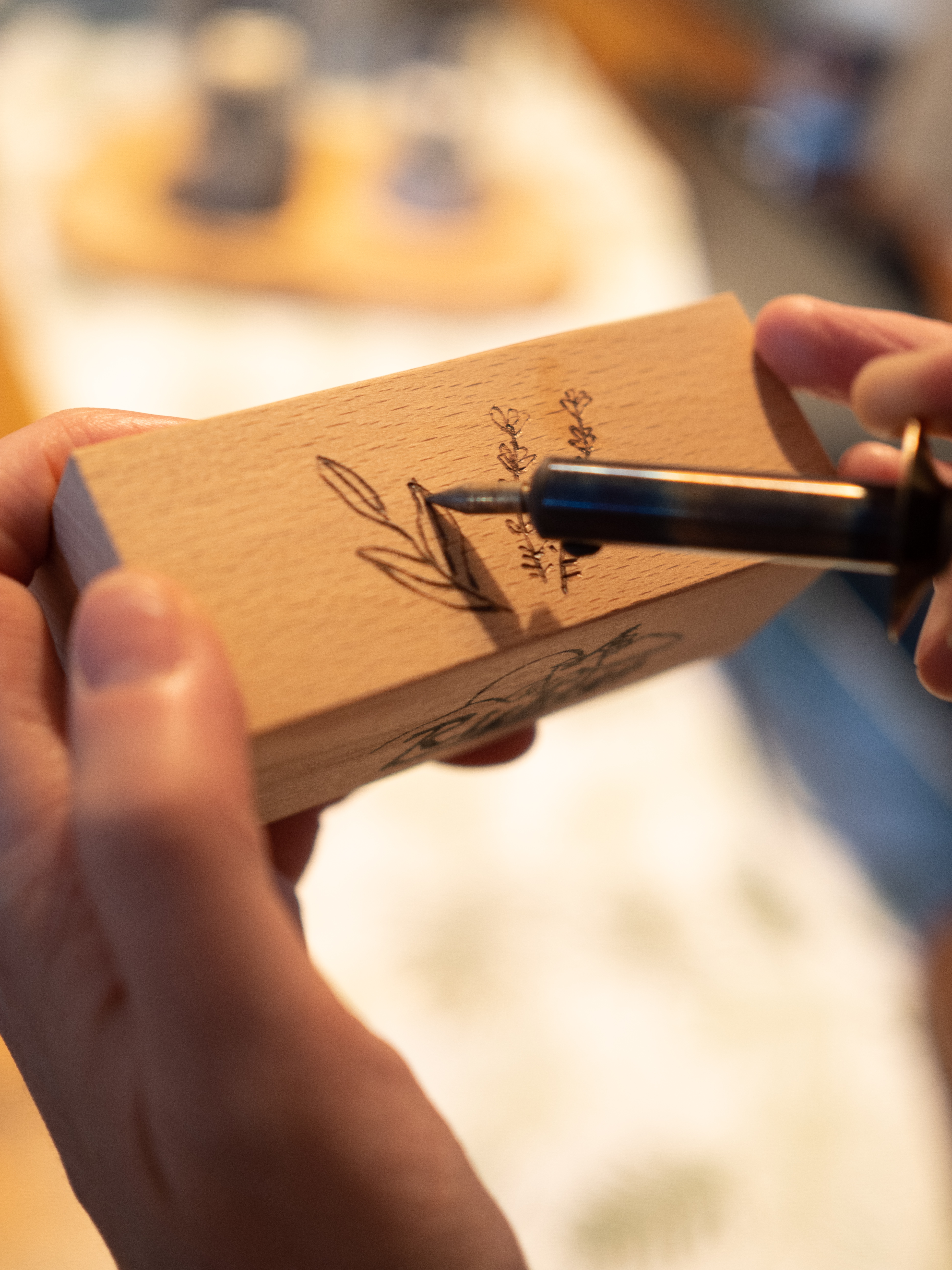 Ein Holzblock ist entstanden, der durch meine von Hand eingravierten Pflanzmotive nicht nur zum Unikat, sondern auch in jeder Küche zum Hingucker wird.