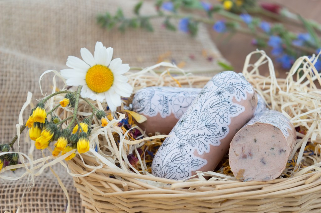 Eine Vielfalt aus zarten, essbaren Blüten und edles Rosenblütenwasser dominieren den Geschmack der Blütenleberwurst, die damit wahre Sommergefühle weckt.